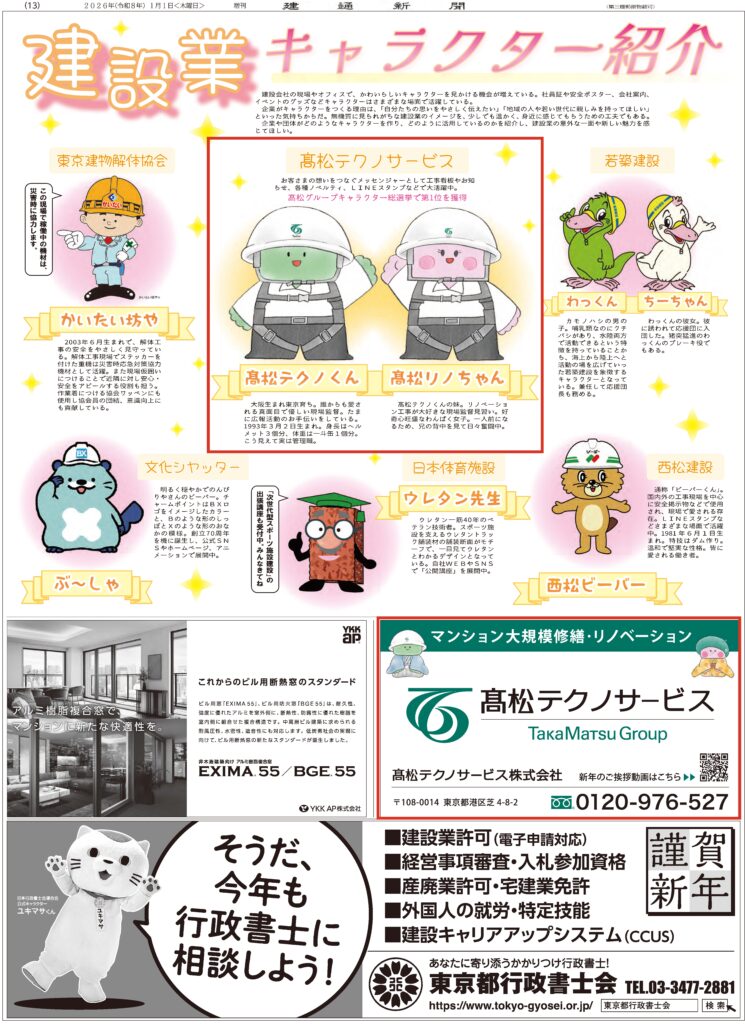 【メディア掲載/東京版】「建通新聞」に令和8年新春特集号広告協賛、公式キャラクターが掲載