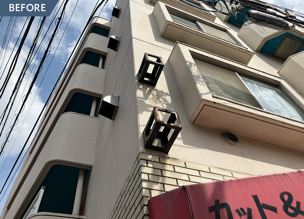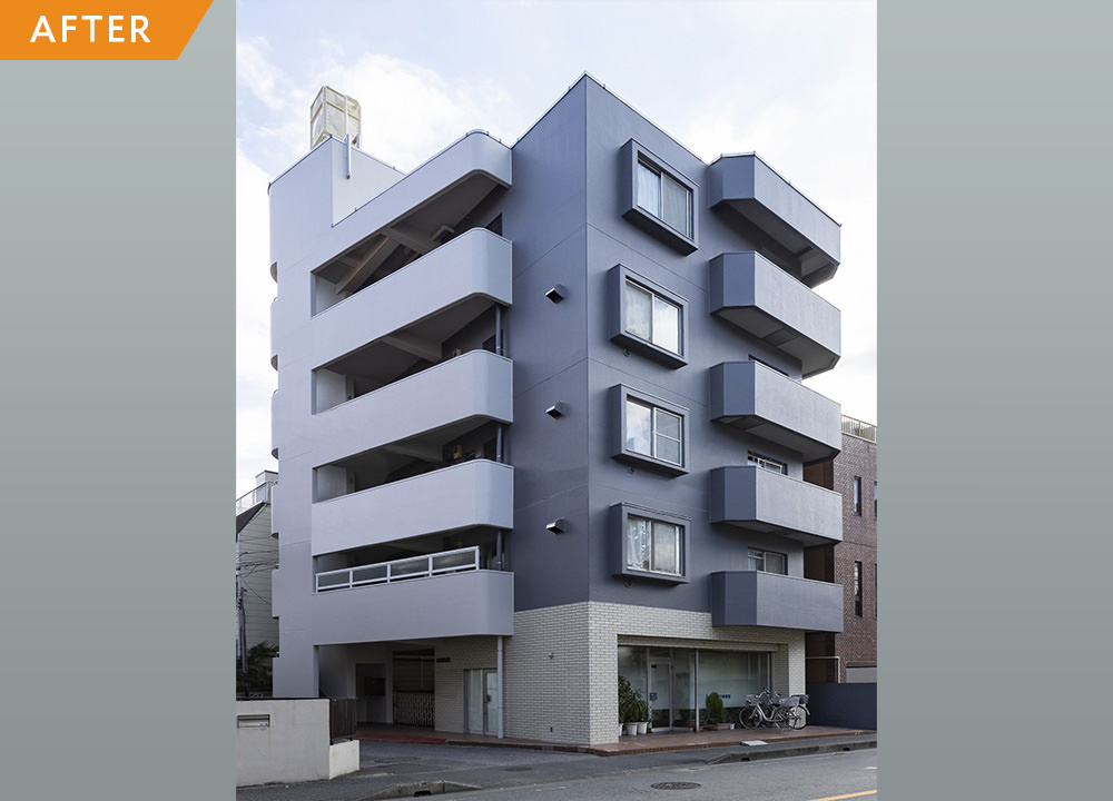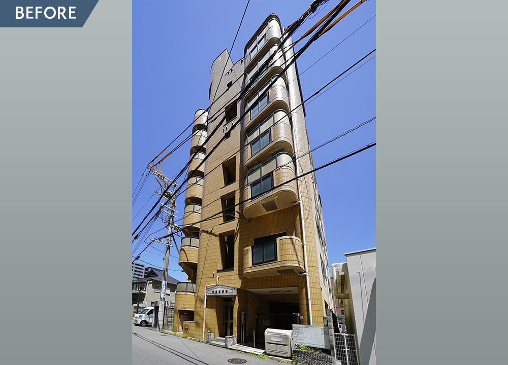 老朽化が目立つため、建替えによる新築も検討されましたが用途地域・日影規制があり、オーナー様は改修を決断。アルミスパンドレルによるデザイン提案を気に入っていただき、新築のような美しい外観に生まれ変わり大変ご満足いただきました。