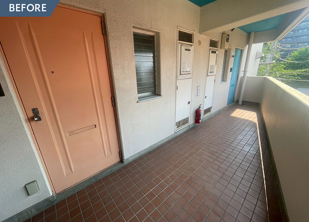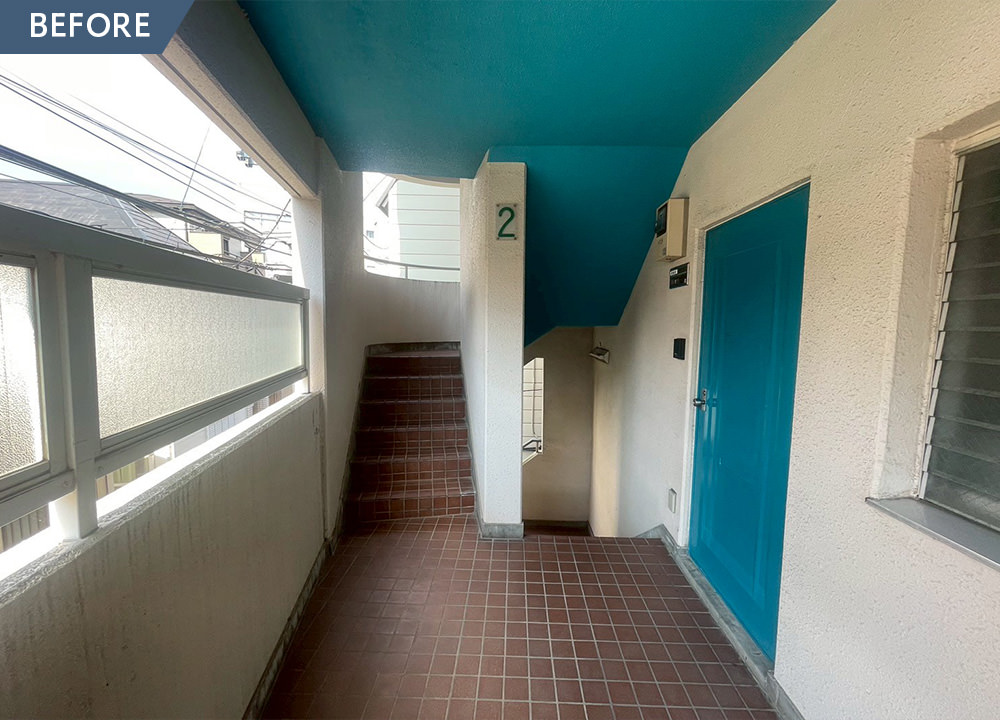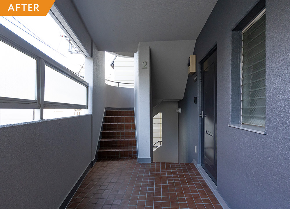 京のまちなみと調和する鉄筋コンクリート造築12年の賃貸マンション。経年による汚れが目立つ共用部は、塗装で壁本来の白さを取り戻しました。