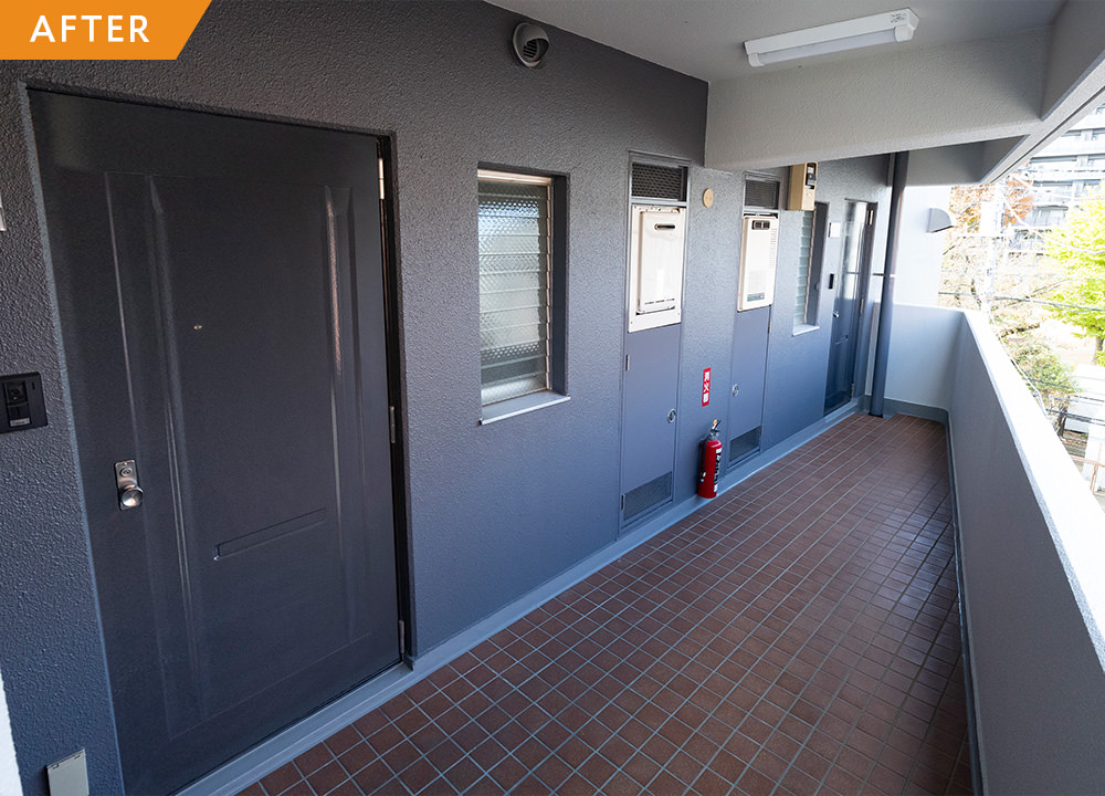 築39年の鉄筋コンクリート造5階建て賃貸マンションの改修事例です。建物としては2回目の大規模改修工事でしたが、オーナー様の世代交代を機に、これまでの昭和的な印象を一新したいとのご要望から外観デザインを全面的にリニューアルしました。建物の形状に合わせて落ち着きのあるダークグレーと白を配色し、濃淡を分けてメリハリをつけることで、時代に合ったシャープで洗練された外観に生まれ変わりました。共用廊下や玄関扉については「建築した父の思いも残したい」というご意向を受け、既存の外壁タイルや茶系の共用部タイルと自然に馴染むカラーをご提案。新しさと調和を両立させています。また、管理会社様から古くて困るとご相談があった郵便ポストを交換し、エントランスの印象を向上させました。さらに、換気フードには油垂れによる外壁汚れを軽減するため水切りを新設し、メンテナンス性の改善にも貢献しています。イメージ通りになってよかったと大変ご満足いただき、今後は賃料アップも考えていきたいと収益性向上にもつながる結果となった改修事例です。