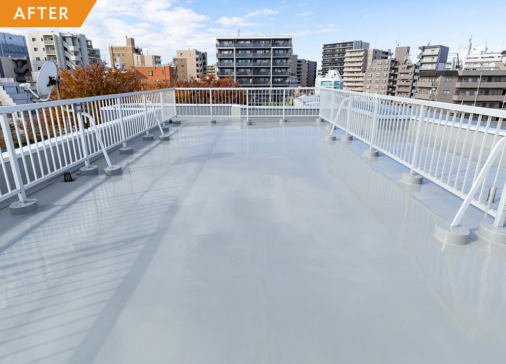 マンションの老朽化と空室対策のため改修をご決断されました。外壁は、ヒビ割れや欠けが目立っていたため、補修と塗り替えを実施。良好な景観を形成する景観条例に基づき、地域の特性を活かした現代的なライトグレーに。屋上・共用部は防水工事を行い、エントランスの屋根や床、扉の改修も実施しました。1階部分のコンビニエンスストア店舗も経営されるオーナ―様。建物のデザイン性や機能性を高めつつ、マンションの入居率アップや店舗利用者増も期待できます。